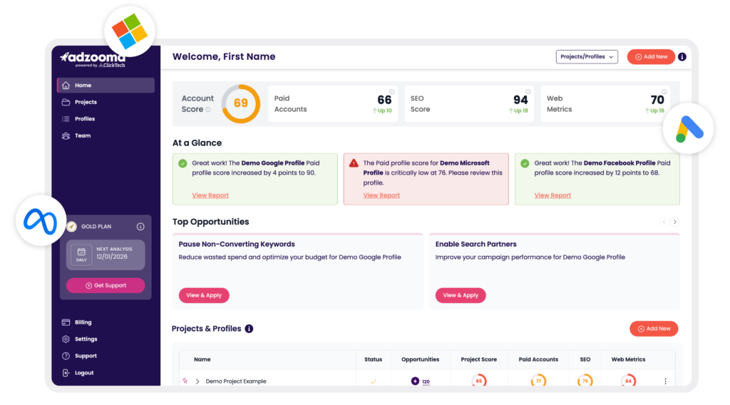 Adzooma gives you the insights and tools to act fast – with audits, budget tracking, and optimisation in one place for Google, Meta, and Microsoft Ads.