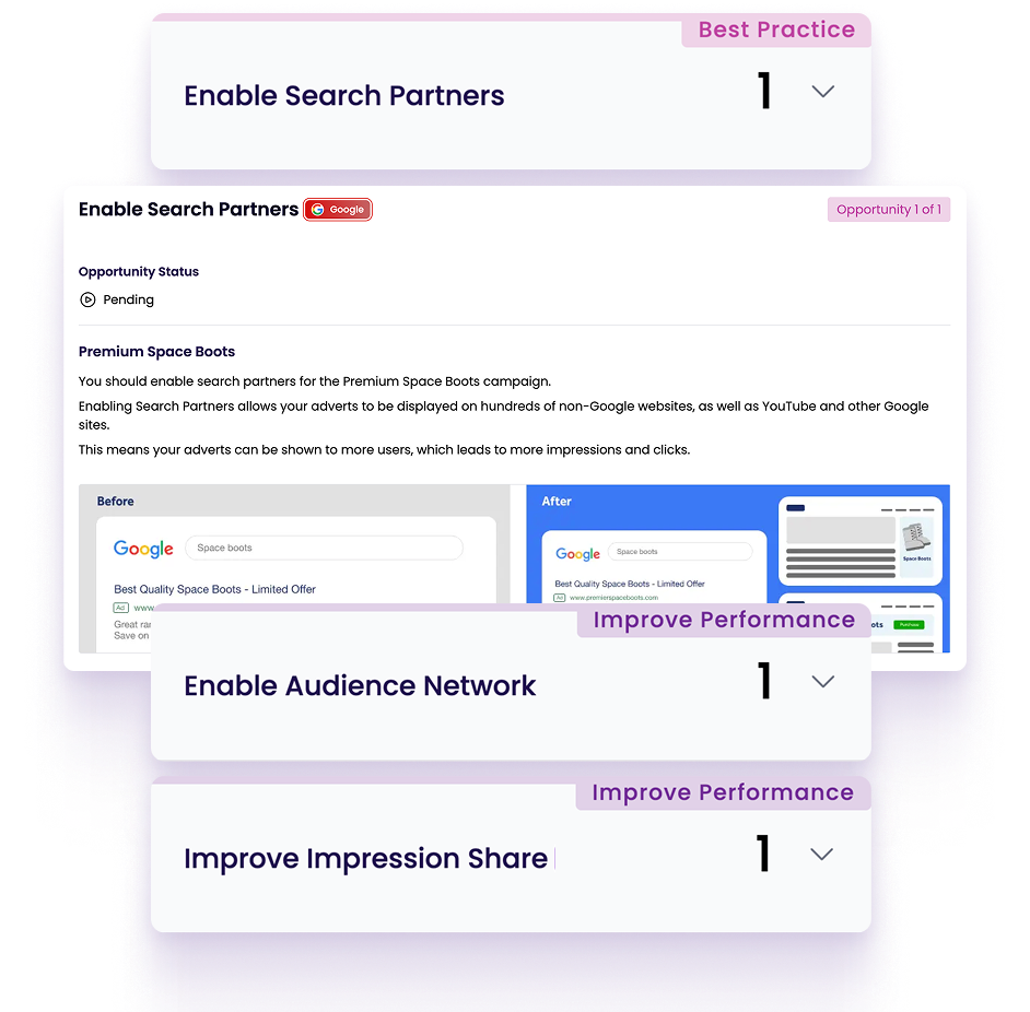 Get data-driven recommendations that reduce wasted spend, refine targeting, and optimise bids across all your ad platforms.