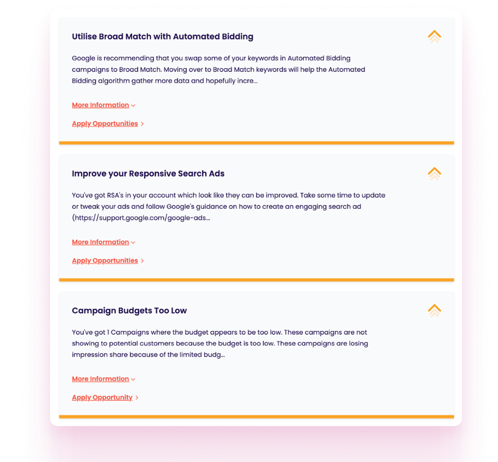 That’s fine. Adzooma lets you apply opportunities campaign by campaign, so you stay in control of where and how expansion is activated.