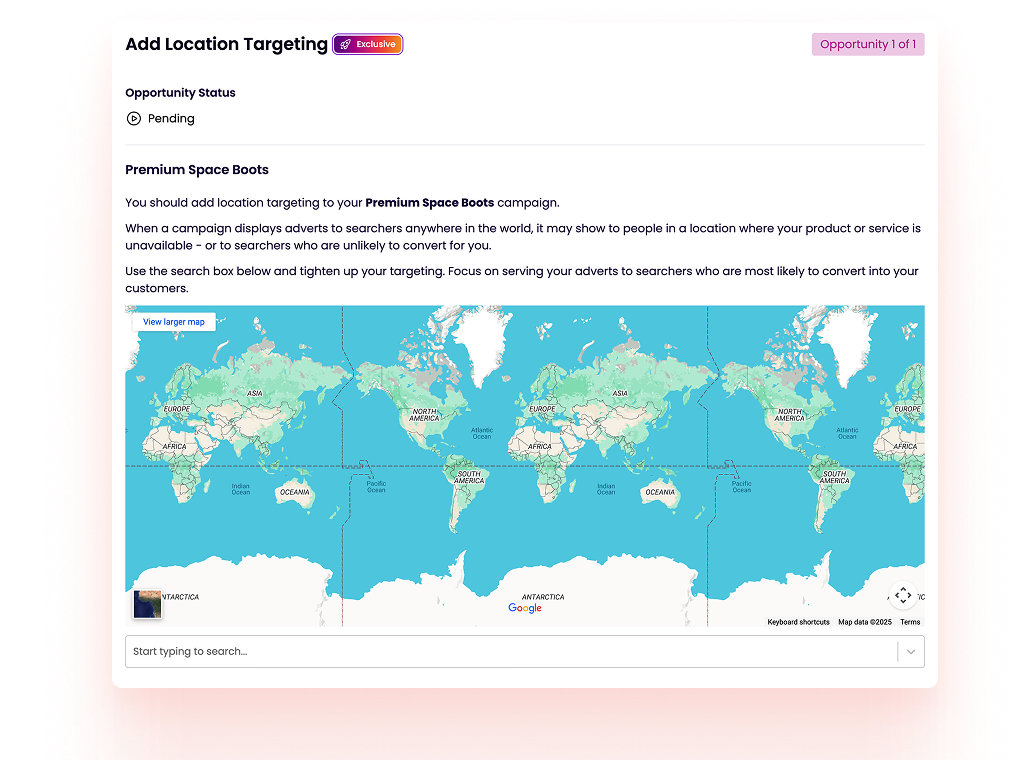 Location targeting ensures your ads are served to the right people in the right places. Adzooma surfaces gaps and shows you where to refine.