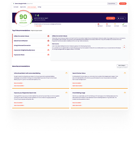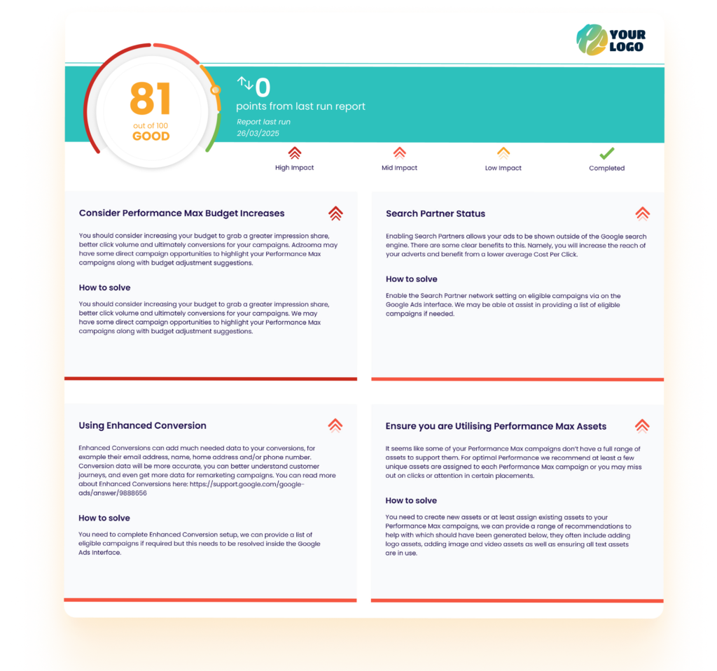 It’s a free Google Ads audit that gives you a performance score and a prioritised list of recommendations to improve efficiency and ROI.